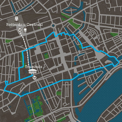 De route begint bij het Tramhuis op het Eendrachtsplein. Na 6 kilometer eindigt de wandeling aan de spreuk van Jules Deelder op de Nieuwe Binnenweg 125a.